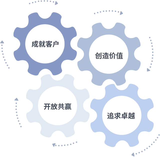 成就客户是一切决策的出发点,,,,创造价值是衡量所有工作的标准,,追求卓越是我们做事做人的态度,,开放共赢是我们的格局也是最终的结果。。。价值观的齿轮环环相扣,,,推动着组织里的每个人不断向前。。